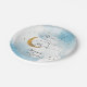 Placa de papel de chá de fraldas do garoto Dreamy apresentando o céu em azul-aquarela com estrelas de brilho dourado e lua. O texto diz "estamos sobre a lua."