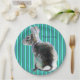 Placas de papel grandes com design de coelho em listras azuis. O nome no prato pode ser mudado para o seu, e o coelho foi melhorado. Haverá guardanapos para combinar. Estas seriam também excelentes para uma festa de Páscoa.