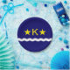 Papelão com design com bandeira de Kinshasa, capital da República Democrática do Congo, bandeira azul com onda branca, duas estrelas ouros e letra "K" no centro