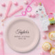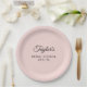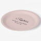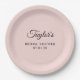 Crie pratos de papel redondos e minimalistas personalizados para uma festa de banho de noiva. Uma caligrafia preta sofisticada clássica combinada com uma fonte serifada em maiúsculas. Personalize os estilos de letra para criar sua própria louça para a celebração especial dela. Personalize a cor de fundo rosa suave.