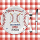 Step up to the plate and celebrate in style with this classic baseball-themed birthday invitation! Featuring bold “SWING ON OVER” text, red pinstripes inspired by a baseball jersey, crossed bats, and a baseball, this design is perfect for your little slugger’s big day. Great for boys of all ages who love the game! Personalize with your party details and get ready for a home run celebration.