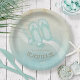 Esta placa de papel nas cores suaves do mar e da areia permite que você adicione facilmente seu próprio nome e texto usando o modelo fornecido. A simples imagem de óculos e chinelos sobre um fundo angustiado, de aquarela, é destacada por um sotaque de onda em aqua e branco. Procure ID623 para ver a coordenação de elementos à beira-mar e produtos adicionais com este design.
