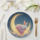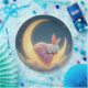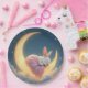 Um coelho branco fluffy é acolhido num cobertor rosa, descansando pacificamente numa lua crescente brilhante num céu noturno sonolento. Pode ser usado para um chá de menina.