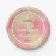Esta placa de papel rosa e dourada é um na moda adicional ao janto de Natal de uma menina. A rosa claro e o fundo dourado da aquarela são acentuados com uma cruz branca e um texto personalizado para o nome e a data de Natal do bebê.