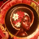 Beleza afro-americana com poinsetos vermelhos e brancos no cabelo. Um design único de que o convidado falará.