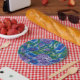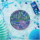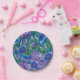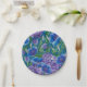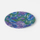 Bellisima Repeat Pattern Floral Paper Plate - de uma pintura acrílica original de Jodi L. Lopez. Hipóteses roxas e papoilas azuis contra fundo azul. Corresponder a suprimentos de festa como papel de embrulho e guardanapos no mesmo padrão Coleção.