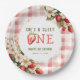 Strawberry First Festa de aniversário Berry Paper Plates apresenta morangos perfeitamente doces e xadrez de gingham fofinha.