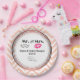 Placas personalizadas de papel de casamento com um design de casamento de estilo moderno - lábios de kissy cor-de-rosa glamourosos e uma ilustração de bigode retrógrada masculina. Colocado sobre um fundo de cromo de pêssego. O texto diz que o Sr. e a Sra. e você pode personalizar com seus nomes e data de casamento dentro um círculo de gradiente de ouro rosa.