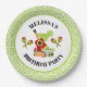 Chapas de papel de aniversário personalizadas com um padrão de fundo composto por espirais de verde limão. A camada sobre o topo é um círculo branco. Ilustrada com uma margarita limão, uma guitarra espanhola vermelha, algumas gotas de guacamole, abacates, tacos e molho quente.