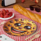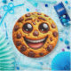 A imagem apresenta um sorridente biscoito de chocolate chip. Pode ser visto como um exemplo de estilo criativo de comida ou uma ilustração humorística e alegre.