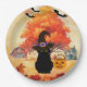 A paper plate with autumn colors, a black cat , haunted house and barn. Matching napkins available.