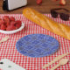 Two images showcase a round plate with a blue geometric and floral pattern. The first image displays the plate from the top, and the second shows it angled.