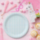 Conjunto de oito placas de papel de 9" com uma imagem de gingham azul bebê. Ver azulejos e portas copos de cerâmica quadrada correspondentes. Veja toda a coleção Kidz Korner Plate na categoria HOME na seção KIDZ KORNER.