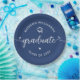 Be proud, rejoice and showcase this milestone of your favorite grad! Celebrate with these simple, modern, bold custom paper plates. Fun white handwritten calligraphy script with cute, playful hearts and a graduation cap icon overlay a navy blue background. Personalize the custom text with your graduate’s name and class year or special message. Available in 2 sizes: 7” or 9”, round or square. Matching invites, thank you cards, hand fans, banners, yard signs and other graduation goodies are also available in this trendy and playful collection. Guaranteed to add stylish fun to their special party!