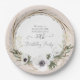 "Blush BOHO Anemone Floral Wreath Festa de aniversário Plate." Pintada elegantemente com aquarelas, coroa floral com flores brancas de anêmona, folhagem de folhas de eucalipto, folhas de oliveira, salgueiro de rata e galhos foram criados por uma artista e designer internacionalmente licenciada, Audrey Jeanne Roberts, autora.