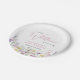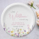 Elegant baby girl shower paper plates with "a little wildflower is on her way" showcased in grey typography and a stylish pink script, and boho-inspired whimsical watercolors of dainty purple, pink and yellow wildflowers. Add the name of the mother-to-be in simple pink lettering.