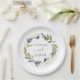 Esses pratos de papel para bolo de casamento com folhagem de outono são perfeitos para um casamento de outono. O design moderno e rústico apresenta folhas em azul naval, verde sage e dourado com ramalhetes de flores azul-escuras. Esses pratos de papel descartáveis são perfeitos para a mesa de bolo ou sobremesa. Personalize-os com os nomes dos noivos.