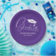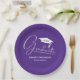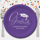 As placas de papel de festas roxas contêm a palavra "Formando", o ano de aula, o seu nome e o nome da sua escola em letra chique. MAIS cores e itens CORRESPONDENTES em nossa coleção.