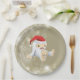 Um prato de papel para a sua festa com uma ilustração de um bonitinho monstro de neve de Natal, boneca de brinquedo, vestindo um chapéu de Papai Noel vermelho. A pequena criatura de neve tem uma corda de tração para fazê-lo falar e ele está coberto de pele branca macia com sotaques castanhos-claros. O fundo é uma cor castanha clara, com luzes brilhantes e flocos de neve cintilantes, com rico florescente.