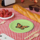 Esta placa de papel apresenta uma bela ilustração de uma borboleta Monarca laranja numa cor de fundo verde.