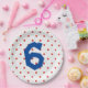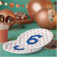 Design apresenta imagens padronizadas de balões e confete contra um fundo branco. A idade da criança é ilustrada em azul brilhante no centro.