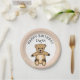 Barramento de Brinquedo de Brinquedo de Brincadeira. Uma placa de papel de festa de aniversário de ursos de pelúcia com o nome e a idade da criança.