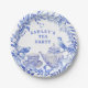 Esses pratos de papel têm um design monocromático com um conjunto de chá azul e branco rodeado por pássaros e flores. Há uma grinalda de folhagem azul na borda externa. Esses biscoitos são perfeitos para um chá, festa de aniversário, chá de bebê ou almoço de noiva.