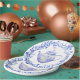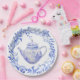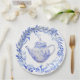 Esses pratos de papel para bule de chá têm um design monocromático com um conjunto de chá azul e branco rodeado por uma grinalda de folhas azuis. Esses pratos seriam perfeitos para um chá ou para uma festa de aniversário, chá de bebê ou almoço de noivado.