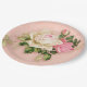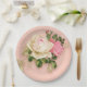 Pratos de papel com um buquê de rosas florais com flores brancas e rosadas. O fundo é rosa com um padrão floral. Design bonito e elegante.