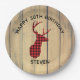 Festa de aniversário de papel com estilo rústico. Projetado com uma cabeça de veado com galhadas, feito de xadrez vermelha. As tábuas de madeira falsas para o fundo dão-lhe uma sensação estranha.