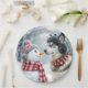 Um cão rouco e um boneco de neve se rodeiam por uma paisagem nevada