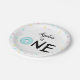 Placa de papel do aniversário bonito para uma festa de aniversário do tema da rosquinha que caracteriza a rosquinha com esmalte da hortelã. O texto diz que "UM" com uma filhós que se enche no ponto para a letra "O." você pode personalizar este artigo adicionando o nome da sua criança na parte superior.