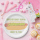 Criar pratos personalizados de festas personalizadas de cachorro-quente para bolachas, reuniões familiares, competições de comer cachorro-quente e muito mais. Essas placas mostram uma ilustração de um cachorro-quente com um relento de picles e seu próprio texto personalizado em verde-claro, de cima para baixo.
