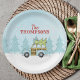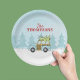 Carro Azul Rustic Vintage ou Vagão Woodie com Árvore de Natal Freshly Cortada em cima dirigindo no floco de neve em queda. Uma linda cena de inverno no interior que retrata uma tradição familiar familiar familiar. Um design personalizado para sua festa de Natal e Feriado ou reunião. Esta design apresenta um caminhão vermelho de Natal, moderna cor d'água, família festiva de neve, festiva de verde rústico e giro, papel de campo descartável neve, tendências nostálgicas vermelhas e verdes, inverno de árvores de Natal, pinheiros de ilustração antiquados, caligrafia moderna de pincel, chic de fazenda rural, uma festa de festas de férias fornece louça