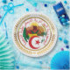 A casaco nacional de armas da Argélia é mergulhada numa forma circular, repleta de ouro falso, e colocada no meio de uma falsa coroa de ouro.