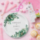 Esta placa de papel projetada para o casamento é mostrada com uma adorável impressão floral de magnólia verde. Também oferecemos guardanapos de papel correspondentes. Personalize este item e altere o texto do exemplo para o seu com este modelo. Imagem licenciada