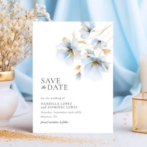 Placas de papel de design floral de flores silvestres de cor aquosa, elegantes e delicadas. Pastel, poeirento, pincelado, cor de água botânica azul e dourada e lavagem. A qualquer hora do ano. Perfeito para a época de primavera de casamento. Modelos fáceis de editar. Consulte a coleção correspondente 'DANIELLA'