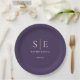 Esta placa de papel de casamento púrpura e dourada minimalista pode ser personalizada com suas iniciais, nomes e data especial de monograma. Projetado por Thisnotme©