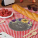 Respiro de bebê, margaridas, rosas roxas, pratos de papel para casamento rústico de outono com girassóis