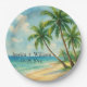 Oceano, praia tropical, areia, palmeiras, aquarela litorânea, noiva e noiva, pratos modernos de papel de Casamento. Simples tipografia, roteiro. Personalize-o com seus detalhes.