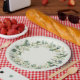 Chapas de natas elegantes, com morangos pintados à mão e eucalipto em uma bela coroa botânica. Outras cores e elementos de coordenação disponíveis.