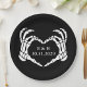 O esqueleto negro do coração de pratos de papel descartáveis com um tema "até a morte nos separarem". Suprimentos ideais para festa de casamento, ensaio ou recepção casual. Personalize a dentro do coração com as iniciais do golpe e a data.