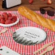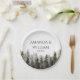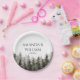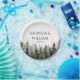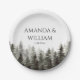 Pinheiros rústicos verdes, pratos de festa de casamento de papel.