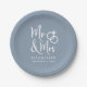 Placas de papel azul empoeiradas personalizadas para sua recepção de casamento com "Sr. & Sra." escritas em um grande roteiro branco e uma ilustração branca de dois anéis de casamento reunidos. Adicione sua data de sobrenome e casamento.