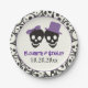 Crânios divertidos Placa de papel de noiva roxo e preto do Halloween, apresentando uma noiva de casal do crânio preto e noiva sobre fundo de marfim e uma borda padrão do crânio. O noivo veste um chapéu roxo e a noiva um arco roxo. Este modelo de casamento do estilo gótico moderno e contemporâneo é perfeito para um casamento, chá de panela, recepção, noivado ou festa de aniversário de Halloween.