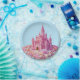 Uma ilustração vibrante de um majestoso castelo cor-de-rosa com múltiplas torres e bandeiras, aninhadas num leito mágico de conchas marinhas pastéis, corais e flores suaves inspiradas no oceano. A arquitetura do conto de fadas do castelo é pormenorizada e real, erguida contra um céu azul claro. A composição circular adiciona um charme caprichoso, fazer este design perfeito para amantes da fantasia e celebrações sonhentas e de temas costeiros.