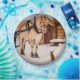 Foto com efeito de tinta. Noite de Natal com estrelas no céu. Um cavalo em frente a uma manga esperando por alguém, Papais noeis talvez? Numa fazenda ao ar livre com neve e coelhos correndo livremente no pátio. Um coelho está de pé em dois pés e "falando" com o cavalo. Guardanapos de papel correspondentes: