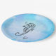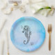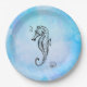 Chapas de papel com um desenho a tinta preta de um cavalo de mar e uma concha. O fundo é uma bonito textura azul de aquarela.