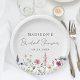 Pratos de papel elegantes para chá de noiva com flores silvestres, apresentando uma borda inferior de flores silvestres e folhagens em tons de rosa, amarelo, roxo, azul e verde em um fundo branco. Personalize os pratos de papel com flores silvestres com o nome da noiva e a data. Os pratos de papel personalizados com flores silvestres são perfeitos para chás de noiva de primavera e verão.