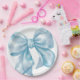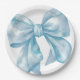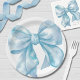 Um charmoso design de prato de papel apresentando um grande laço azul em aquarela no centro. Este design simples, minimalista e elegante é perfeito para um chá de bebê para menino, um tema de chá de noiva como "Ela está dando o nó", ou uma celebração "Algo Azul Antes de Eu Me Casar", bem como outros temas de festa fofos.